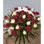 Klasyczna kompozycja w koszu, łącząca intensywną czerwień z czystą bielą, to eleganckie zestawienie o silnym, wyrazistym charakterze. Kontrastujące barwy tworzą harmonijną i ponadczasową całość, która zwraca uwagę i pozostaje w pamięci.